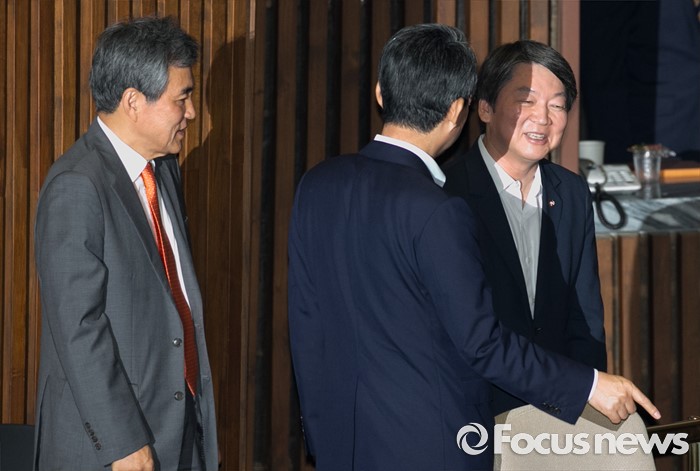 (서울=포커스뉴스) 4일 오전 서울 여의도 국회에서 열린 343회 국회(임시회) 6차 본회의, 경제에 관한 대정부 질문에 참석한 안철수(오른쪽부터) 국민의당 전 대표가 김성식 정책위의장, 이상돈 의원과 대화하고 있다.