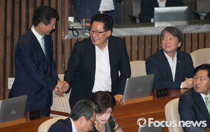 (서울=포커스뉴스) 4일 오전 서울 여의도 국회에서 열린 343회 국회(임시회) 6차 본회의, 경제에 관한 대정부 질문에 참석한 천정배(왼쪽) 국민의당 전 대표와 박지원(가운데) 비대위원장이 인사하고 있다.