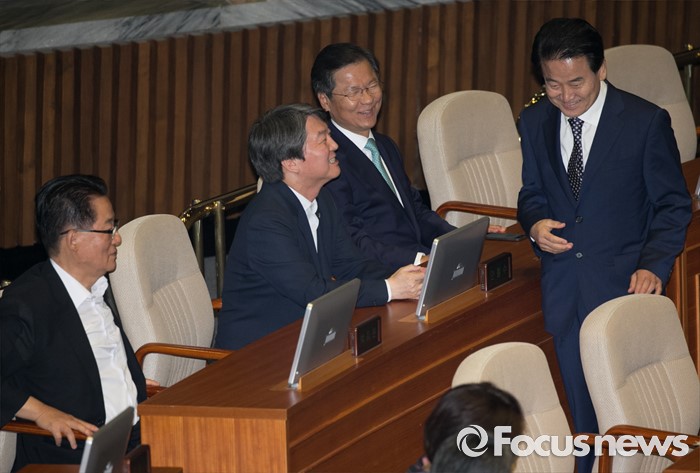 (서울=포커스뉴스) 4일 오전 서울 여의도 국회에서 열린 343회 국회(임시회) 6차 본회의, 경제에 관한 대정부 질문에 참석한 안철수, 천정배 국민의당 전 대표와 박지원 비대위원장, 정동영 의원이 대화하고 있다.