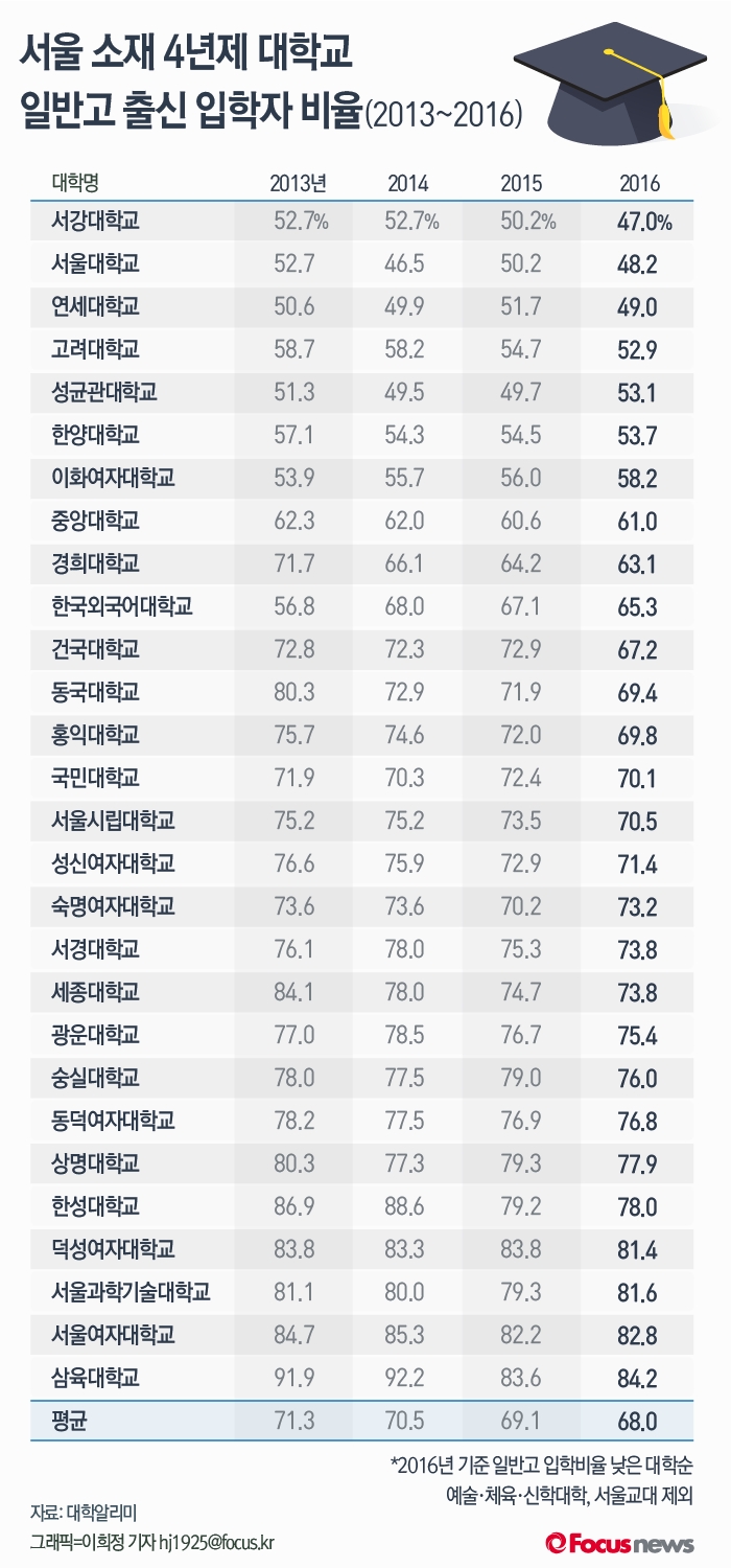 지난 2013년부터 올해까지 4년간 서울 소재 28개 대학교 입학생 현황(예술·체육·신학·교육 계열 대학교 제외)을 살펴본 결과 2013년 평균 71.3% 수준이었던 일반고 출신자 비율이 올해 68%까지 떨어졌다. 해마다 1%p씩 감소하는 추세다.