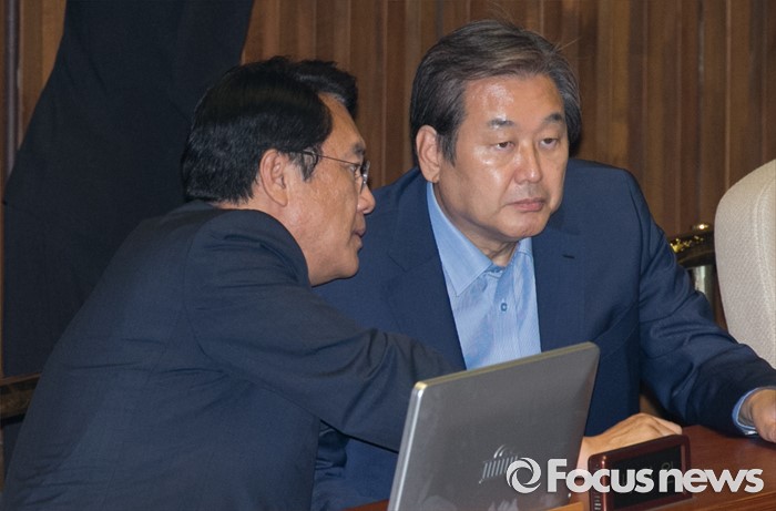 (서울=포커스뉴스) 4일 오전 서울 여의도 국회에서 열린 343회 국회(임시회) 6차 본회의, 경제에 관한 대정부 질문에 참석한 정진석(왼쪽) 새누리당 원내대표와 김무성 전 대표가 대화하고 있다.