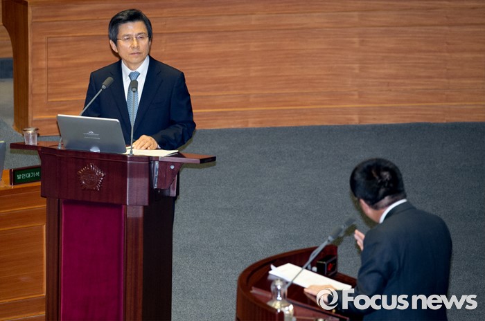 (서울=포커스뉴스) 4일 오전 서울 여의도 국회에서 열린 343회 국회(임시회) 6차 본회의, 경제에 관한 대정부 질문에 참석한 황교안 국무총리가 이종구 새누리당 의원의 질문에 답하고 있다.