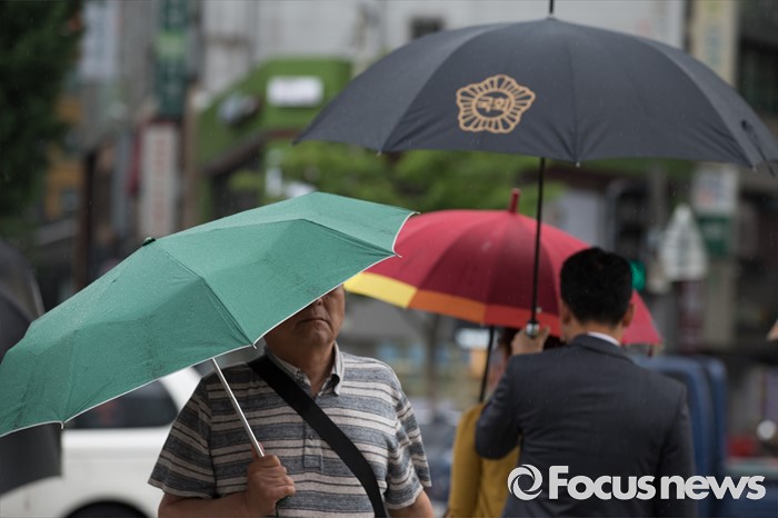 (서울=포커스뉴스) 전국에 호우주의보가 내려진 4일 오전 서울 종로구 광화문 광장에서 시민들이 우산을 들고 지나가고 있다.