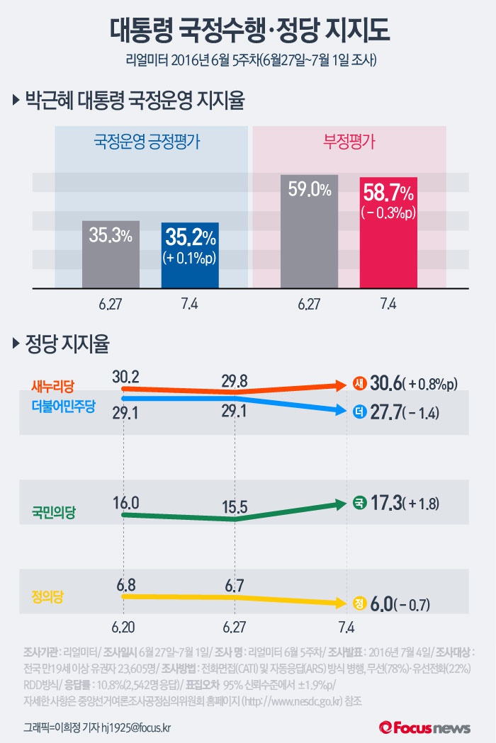 (서울=포커스뉴스) 여론조사 기관 리얼미터의 2016년 6월 5주차 주간집계에 따르면 박근혜 대통령의 국정수행 지지율은 긍정과 부정 모두 소폭 하락했다. 정당별 지지도는 새누리당의 지지율이 0.8%p 상승하면서 30%대를 다시 회복한 것으로 조사됐다.