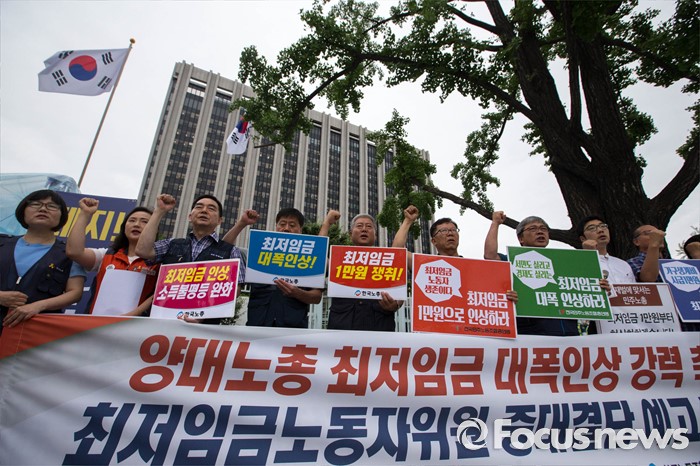 (서울=포커스뉴스) 2017년도 최저임금을 정하는 최저임금위원회 최종협상을 앞두고, 한국노총과 민주노총이 최저임금 대폭인상을 촉구하는 공동기자회견을 열었다.
