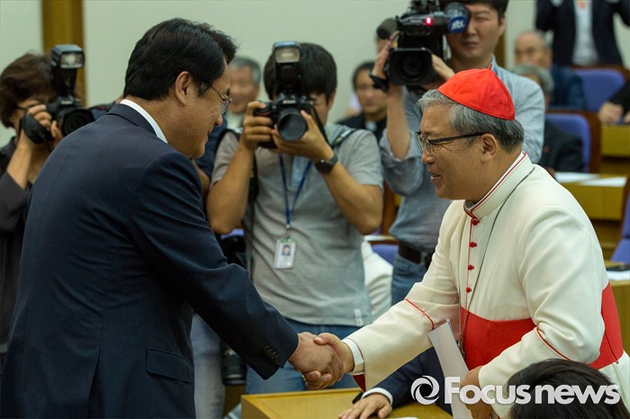 (서울=포커스뉴스) 염수정(오른쪽) 추기경과 정진석 새누리당 원내대표가 4일 오전 서울 여의도 국회의원회관에서 열린 '생명존중포럼 창립총회'에 참석해 악수 하고 있다.