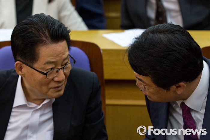 (서울=포커스뉴스) 박지원(왼쪽) 국민의당 비상대책위원장과 정진석 새누리당 원내대표가 4일 오전 서울 여의도 국회의원회관에서 열린 '생명존중포럼 창립총회'에 참석해 대화 하고 있다.
