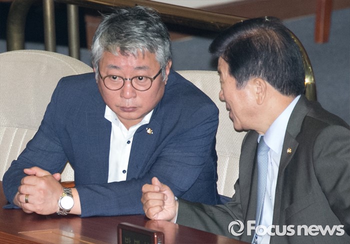 (서울=포커스뉴스) 4일 오후 서울 여의도 국회에서 열린 343회 국회(임시회) 6차 본회의, 경제에 관한 대정부 질문에 참석한 조응천(왼쪽), 박병석 더불어민주당 의원이 대화하고 있다.