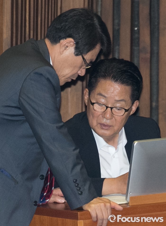(서울=포커스뉴스) 4일 오후 서울 여의도 국회에서 열린 343회 국회(임시회) 6차 본회의, 경제에 관한 대정부 질문에 참석한 이군현(왼쪽) 새누리당 의원과 박지원 국민의당 원내대표가 대화하고 있다.