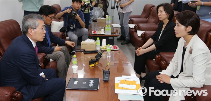 (세종=포커스뉴스) 국회 환경노동위원회 한정애 더불어민주당 간사가 4일 오후 세종시 정부세종청사 최저임금위원회를 찾아 박준성 위원장과 면담을 나누고 있다. 오른쪽 두번째는 송옥주 의원.