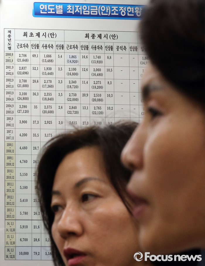 (세종=포커스뉴스) 국회 환경노동위원회 한정애 더불어민주당 간사가 4일 오후 세종시 정부세종청사 최저임금위원회를 찾아 박준성 위원장과 면담을 가졌다. 의원들 뒤로 연도별 최저임금 조정현황이 붙어 있다.왼쪽은 송옥주 의원.
