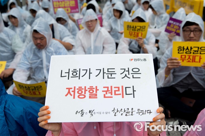 (서울=포커스뉴스) 4일 오후 서울중앙지방법원 앞에서 전국민주노동조합총연맹이 한상균 위원장 석방 판결 촉구 결의대회를 하고 있다.