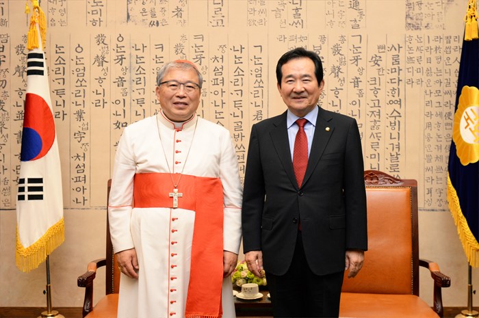 (서울=포커스뉴스) 정세균(오른쪽) 국회의장이 4일 오후 서울 여의도 국회에서 염수정 추기경을 접견, 기념촬영을 하고 있다. <사진제공=국회>
