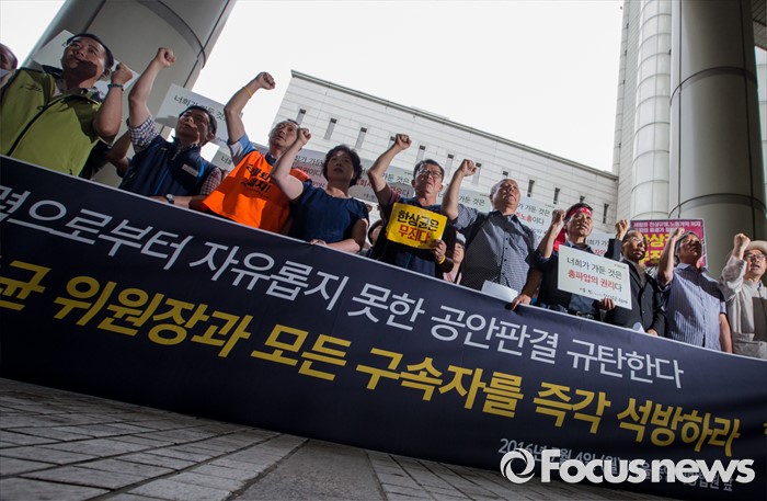 (서울=포커스뉴스) 4일 오후 서울중앙지법 앞에서 한상균 민주노총 위원장의 1심 선고 공판 후 열린 기자회견에 참석한 최종진 부위원장 및 조합원들이 판결의 부당함을 주장하는 구호를 외치고 있다. 지난해 11월 열린 민중총궐기 대회 불법 시위 주도 혐의로 기소된 한 위원장은 이날 열린 1심 재판에서 징역 5년을 선고받았다.