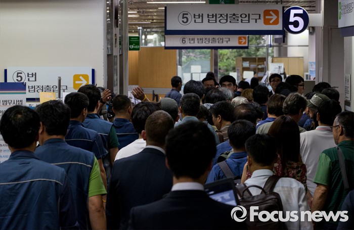 (서울=포커스뉴스) 4일 오후 서울중앙지법 5번 출입구 앞에서 민주노총 조합원 및 관계자들이 한상균 위원장의 1심 선고 공판을 방청하기 위해 줄지어 기다리고 있다. 지난해 11월 열린 민중총궐기 대회 불법 시위 주도 혐의로 기소된 한 위원장은 이날 열린 1심 재판에서 징역 5년을 선고받았다.