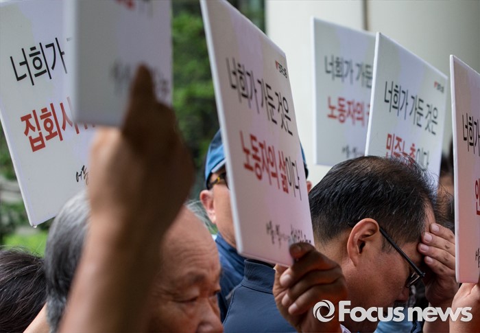 (서울=포커스뉴스) 4일 오후 서울중앙지법 앞에서 민주노총 조합원 및 관계자들이 한상균 위원장의 1심 선고 공판 후 열린 기자회견에 참석해 판결의 부당함을 주장하는 손팻말을 들고 있다. 지난해 11월 열린 민중총궐기 대회 불법 시위 주도 혐의로 기소된 한 위원장은 이날 열린 1심 재판에서 징역 5년을 선고받았다.
