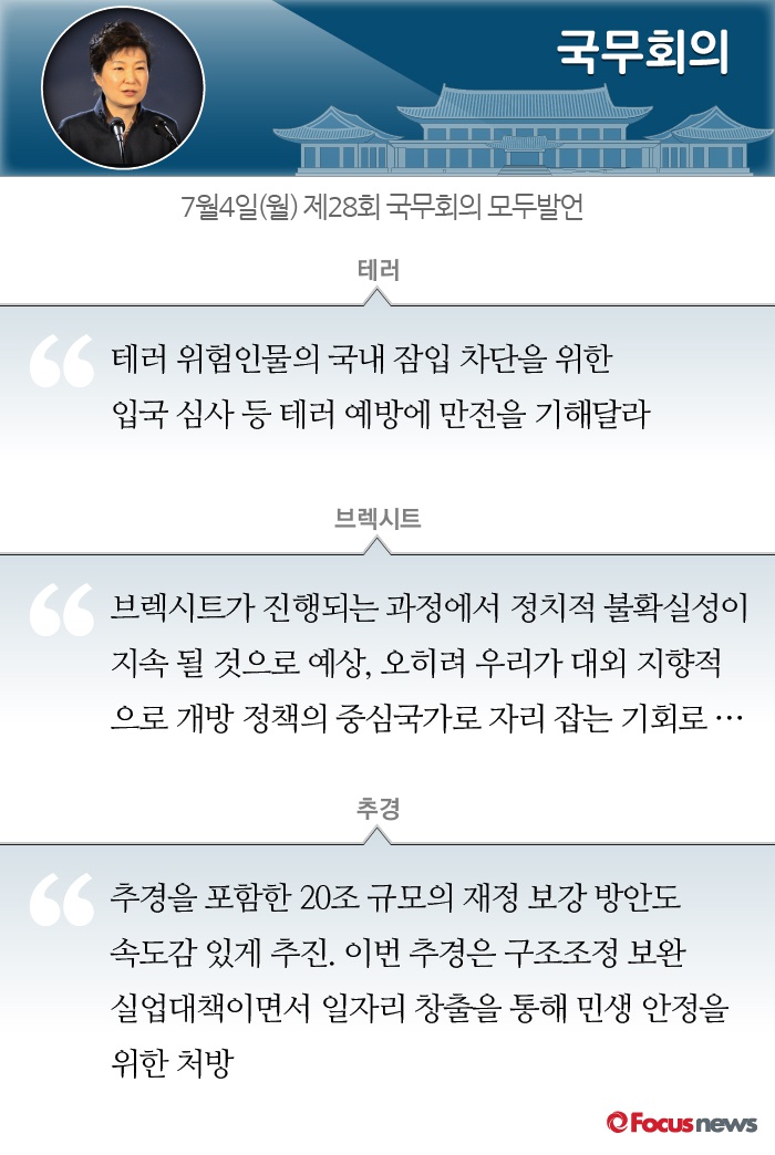 (서울=포커스뉴스) 박근혜 대통령이 4일 오전 청와대에서 제28회 국무회의를 주재했다. 박 대통령은 모두발언을 통해 테러, 브렉시트, 구조조정·추경, 내수진작, 여성정책, 북한 문제에 대해 언급했다.