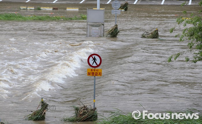 (청주=포커스뉴스) 충청 및 중부지역에 호우경보가 발생한 4일 오후 충북 청주시 무심천 하상도로가 내린비로 잠겨 있다.