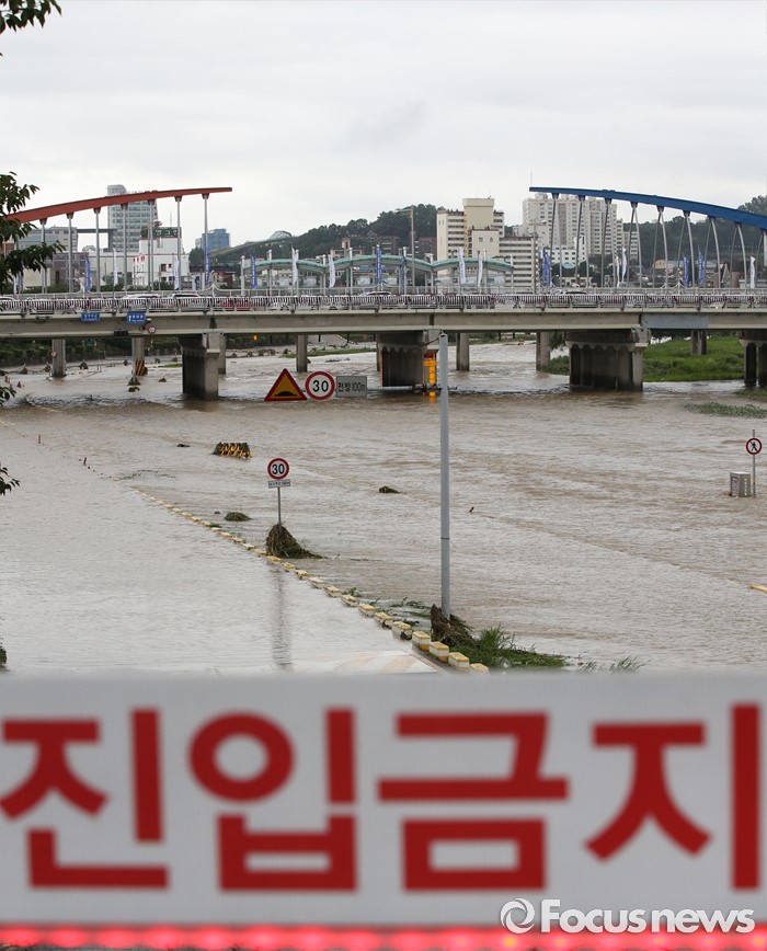 (청주=포커스뉴스) 충청 및 중부지역에 호우경보가 발생한 4일 오후 충북 청주시 무심천 하상도로가 내린비로 잠겨 있다.