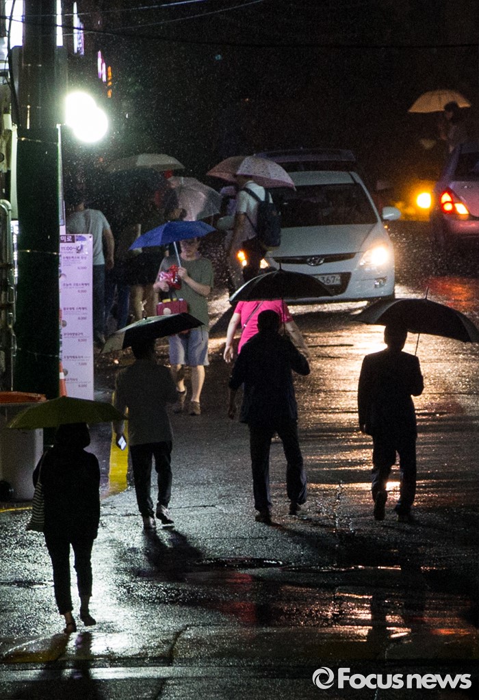 (서울=포커스뉴스) 서울을 비롯한 전국 대부분에 호우주의보ㆍ경보가 발령된 4일 오후 서울 서초역 인근에서 우산을 쓴 시민들이 발걸음을 재촉하고 있다. 기상청은 북상하는 장마전선에 내일 전국에 비가 계속되는 가운데 특히 중부지방에는 국지성 호우가 올 것으로 예상했다.