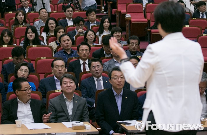 (서울=포커스뉴스) 5일 오전 서울 여의도 국회 의원회관에서 열린 국민의당 성희롱 예방교육에 참석한 박지원 비대위원장, 안철수 전 대표 등 의원들이 문강분 행복한일연구소 대표의 강의를 듣고 있다.