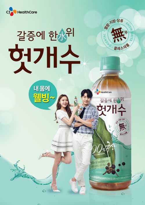 CJ 헛개수 브랜드매니저는 “CJ 헛개수는 100% 국산 헛개 나무 열매를 사용했고 열량, 지방, 당류, 콜레스테롤이 없어 누구든지 즐길 수 있는 갈증해소 웰빙 음료”라며 “소비자 층에게 웰빙 음료로써의 헛개수의 장점을 널리 알리기 위해 CGV 웰빙 헛개수 브랜드관 운영 및 신규광고 전파 캠페인을 진행할 계획”이라고 말했다.CJ 헛개수 모델 이성경, 남주혁 포스터. <사진출처=CJ헬스케어>