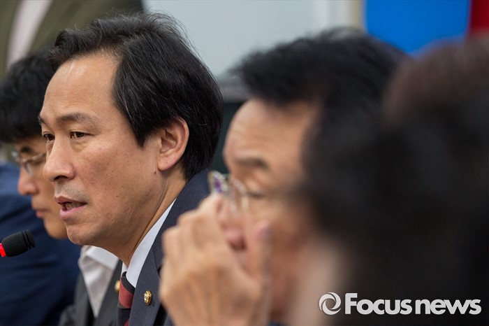 (서울=포커스뉴스) 우상호 더불어민주당 원내대표가 5일 오전 서울 여의도 국회에서 열린 원내대책회의에 참석해 모두발언 하고 있다.