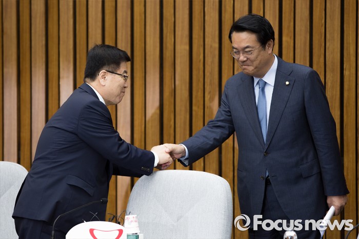 (서울=포커스뉴스) 정진석(오른쪽) 새누리당 원내대표와 김광림 정책위의장이 5일 오전 서울 여의도 국회에서 열린 원내대책회의에 참석해 악수 하고 있다.