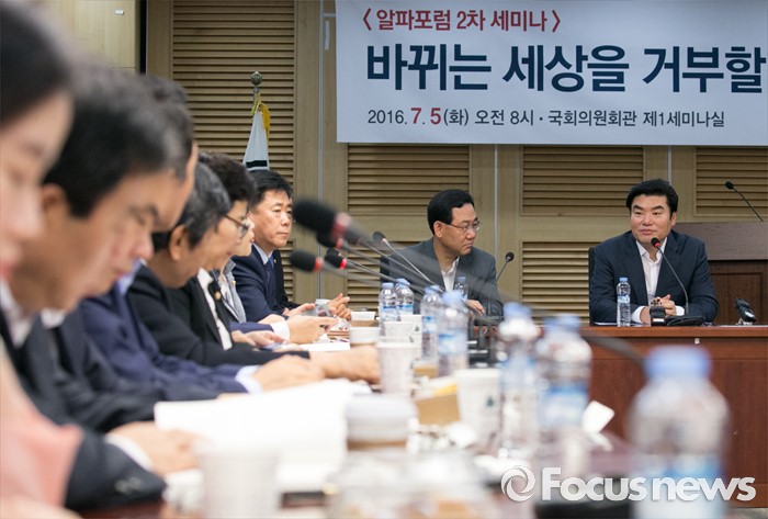 (서울=포커스뉴스) 5일 오전 서울 여의도 국회 의원회관에서 열린 국가미래전략포럼(일명 알파포럼) 2차 세미나에 참석한 원유철(오른쪽) 새누리당 의원이 인사말을 하고 있다.