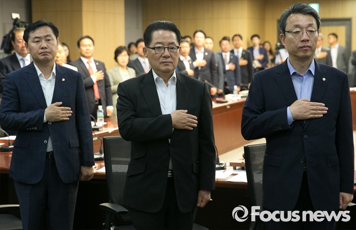 (서울=포커스뉴스) 5일 오전 서울 여의도 국회 의원회관에서 열린 국민의당 의원총회에 참석한 박지원 비대위원장과 김성식 정책위의장 등 의원들이 국기에 대한 경례를 하고 있다.