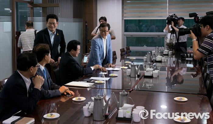 (서울=포커스뉴스) 5일 오전 서울 여의도 국회 의원회관 의원식당에서 열린 남북관계 정상화를 위한 여야 중진 의원 1차 모임에 참석한 원혜영(오른쪽부터), 변재일, 송영길, 조정식, 오제세 더불어민주당 의원 등이 인사하고 있다.