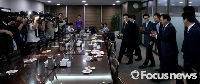 (서울=포커스뉴스) 5일 오전 서울 여의도 국회 의원회관 의원식당에서 열린 남북관계 정상화를 위한 여야 중진 의원 1차 모임에 참석한 의원들이 취재진을 향해 포즈를 취한 뒤 자리로 향하고 있다.