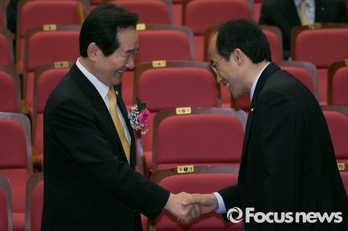 (서울=포커스뉴스) 5일 오전 서울 여의도 국회 의원회관에서 열린 미래성장 경제정책포럼 창립총회에 참석한 정세균(왼쪽) 국회의장과 추경호 새누리당 의원이 인사하고 있다.