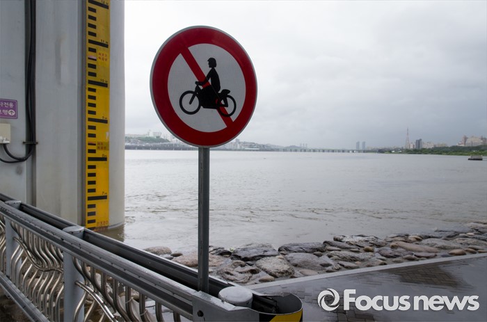 (서울=포커스뉴스) 장마전선이 북상하면서 전국 곳곳에 호우특보가 발표 중인 5일 오전 서울 서초구 잠수교가 통제되고 있다.