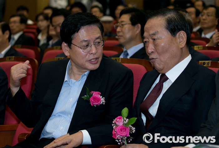 (서울=포커스뉴스) 5일 오전 서울 여의도 국회 의원회관에서 열린 미래성장 경제정책포럼 창립총회에 참석한 서청원(오른쪽), 정우택 새누리당 의원이 대화하고 있다.