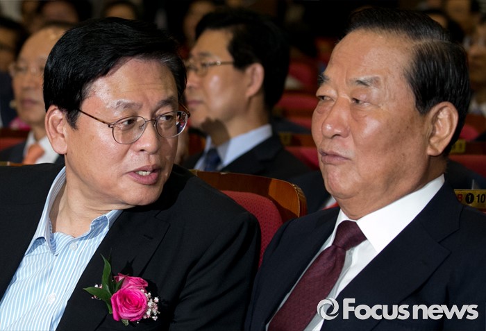 (서울=포커스뉴스) 5일 오전 서울 여의도 국회 의원회관에서 열린 미래성장 경제정책포럼 창립총회에 참석한 서청원(오른쪽), 정우택 새누리당 의원이 대화하고 있다.