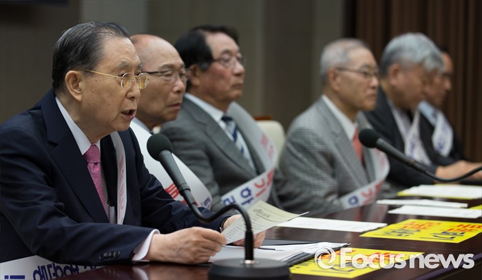 (서울=포커스뉴스)5일 오전 서울 중구 프레스센터에서 열린 북핵폐기 천만인서명, 250만명 돌파 기자회견에 참석한 이종윤(왼쪽) 목사가 인사말 하고 있다.