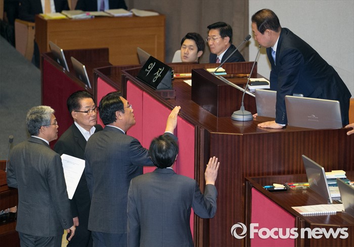 (서울=포커스뉴스) 5일 오전 서울 여의도 국회에서 열린 343회 국회(임시회) 7차 본회의, 정치·외교·통일·안보·교육·사회·문화에 관한 질문에 참석한 이장우 새누리당 의원 등과 김동철 국민의당 의원이 언쟁을 벌이자 정진석 새누리당 원내대표, 우상호 더불어민주당 원내대표, 박지원 국민의당 원내대표와 박주선 국회 부의장이 회의 정회를 논의하고 있다.