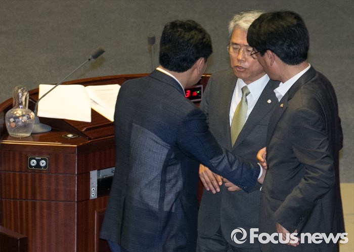 (서울=포커스뉴스) 5일 오전 서울 여의도 국회에서 열린 343회 국회(임시회) 7차 본회의, 정치·외교·통일·안보·교육·사회·문화에 관한 질문에 참석한 이장우 새누리당 의원 등과 김동철 국민의당 의원이 언쟁을 벌이자 박완주 더불어민주당 원내수석부대표, 김관영 국민의당 원내수석부대표가 단상 위의 김동철 의원과 대화하고 있다.