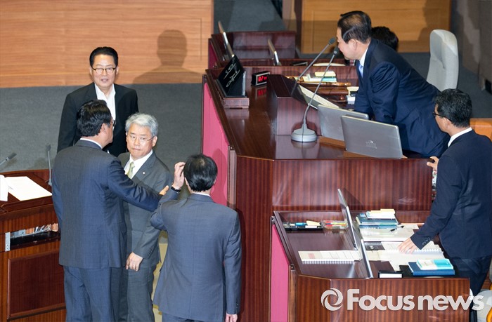 (서울=포커스뉴스) 5일 오전 서울 여의도 국회에서 열린 343회 국회(임시회) 7차 본회의, 정치·외교·통일·안보·교육·사회·문화에 관한 질문에 참석한 이장우 새누리당 의원 등과 김동철 국민의당 의원이 언쟁을 벌이자 정진석 새누리당 원내대표, 우상호 더불어민주당 원내대표, 박지원 국민의당 원내대표와 박주선 국회 부의장이 회의 정회를 논의하고 있다.