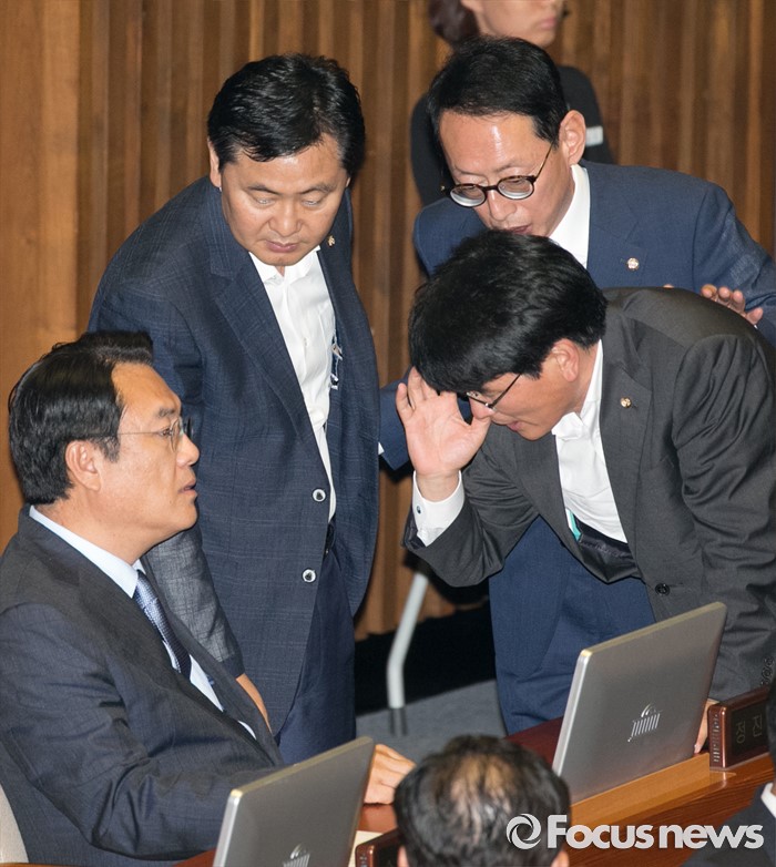 (서울=포커스뉴스) 5일 오전 서울 여의도 국회에서 열린 343회 국회(임시회) 7차 본회의, 정치·외교·통일·안보·교육·사회·문화에 관한 질문에 참석한 이장우 새누리당 의원 등과 김동철 국민의당 의원이 언쟁을 벌이자 정진석 새누리당 원내대표와 김도읍 새누리당 원내수석부대표, 박완주 더불어민주당 원내수석부대표, 김관영 국민의당 원내수석부대표가 논의하고 있다.