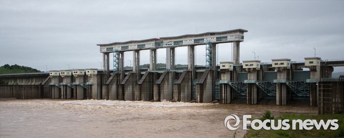 (연천=포커스뉴스) 태풍 네파탁이 북상하고 전국 곳곳에 호우주의보와 경보가 내린 5일 오전 경기도 연천군 군남홍수조절지에서 한국수자원공사가 수위조절을 위해 임진강 강물을 방류하고 있다.