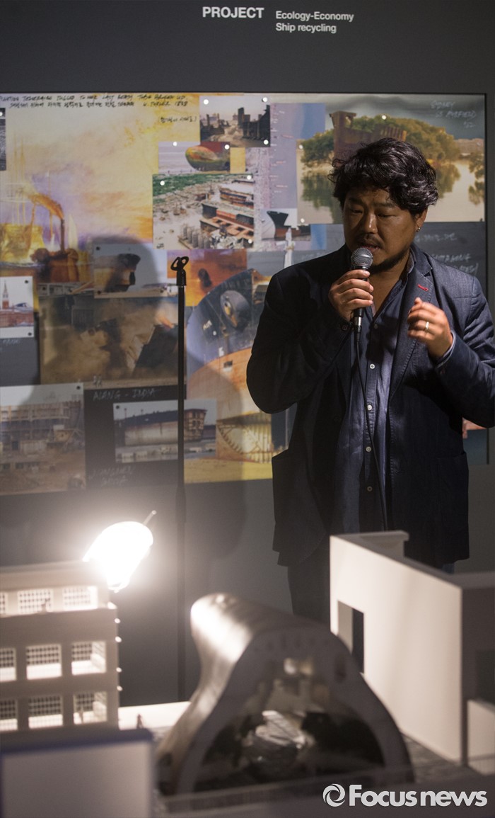 (서울=포커스뉴스) 5일 오전 서울 종로구 국립현대미술관 서울관에서 열린 '젊은 건축가 프로그램 2016' 기자간담회에 참석한 신형철 건축가가 작품을 소개하고 있다..