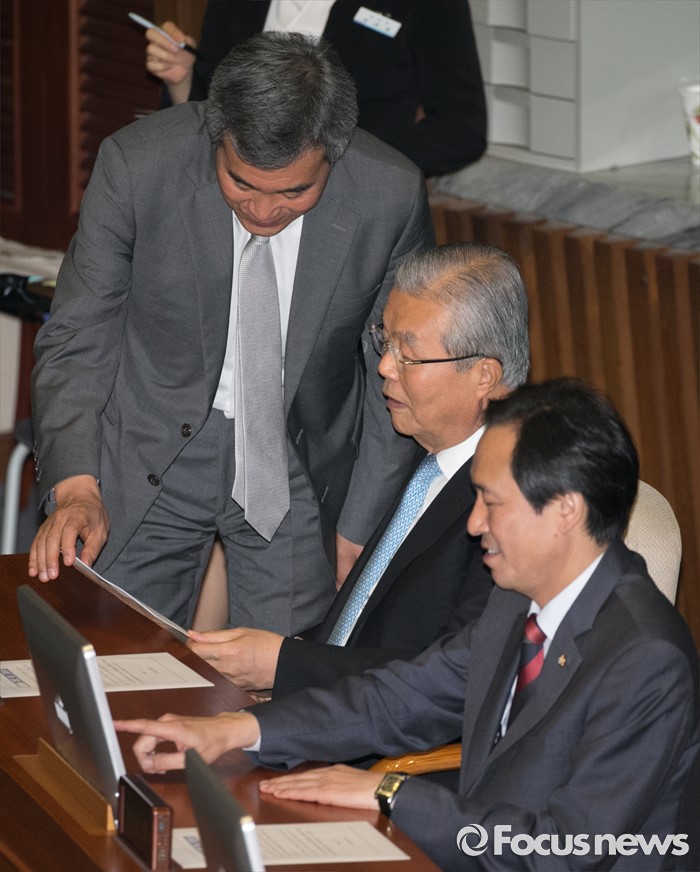 (서울=포커스뉴스) 5일 오전 서울 여의도 국회에서 열린 343회 국회(임시회) 7차 본회의, 정치·외교·통일·안보·교육·사회·문화에 관한 질문에 참석한 김종인(가운데) 더불어민주당 비대위 대표와 이상돈(왼쪽) 국민의당 의원이 대화하고 있다.