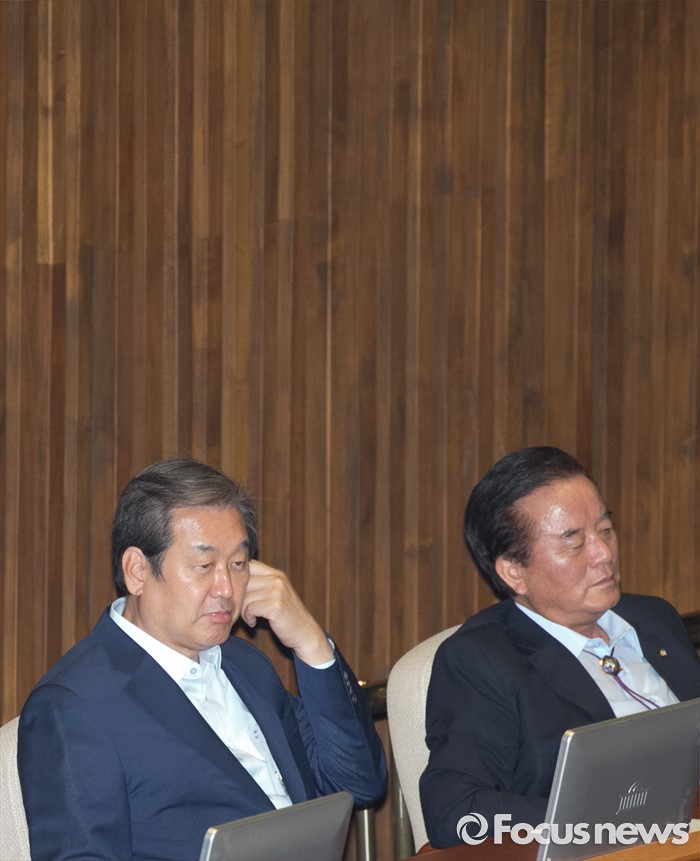 (서울=포커스뉴스) 5일 오전 서울 여의도 국회에서 열린 343회 국회(임시회) 7차 본회의, 정치·외교·통일·안보·교육·사회·문화에 관한 질문에 참석한 김무성(왼쪽), 정갑윤 새누리당 의원이 대정부 질문을 지켜보고 있다.