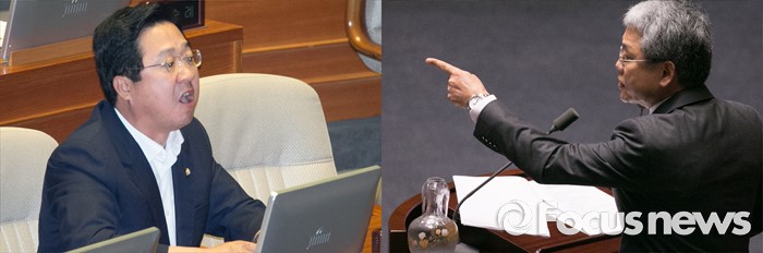 (서울=포커스뉴스) 5일 오전 서울 여의도 국회에서 열린 343회 국회(임시회) 7차 본회의, 정치·외교·통일·안보·교육·사회·문화에 관한 질문에 참석한 이장우(사진 왼쪽) 새누리당 의원과 김동철 국민의당 의원이 언쟁을 벌이고 있다.