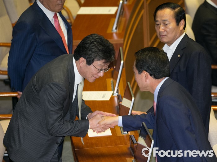 (서울=포커스뉴스) 5일 오후 서울 여의도 국회에서 열린 343회 국회(임시회) 7차 본회의, 정치·외교·통일·안보·교육·사회·문화에 관한 질문에 참석한 유승민 새누리당 의원이 동료 의원들과 인사하고 있다.