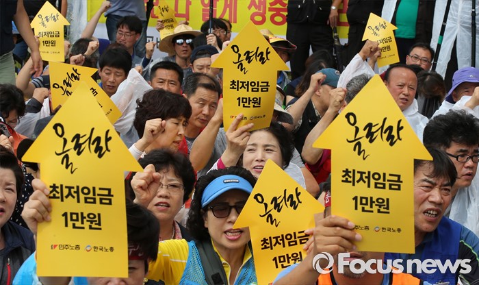 (세종=포커스뉴스) 최저임금위원회 제9차 전원회의가 열린 5일 오후 세종시 정부세종청사 고용노동부 앞에서 한국노총, 민주노총 조합원들이 최저임금 1만원 쟁취 결의대회를 갖고 있다