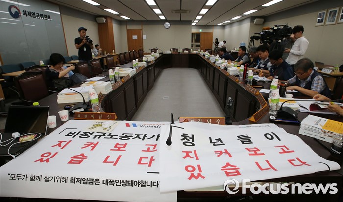 (세종=포커스뉴스) 5일 오후 세종시 정부세종청사 고용노동부 최저임금위원회에서 열린 제9차 전원회에서근로자 위원 자리에 '비정규직노동자가 지켜보고 있다', '청년들이 지켜보고 있다' 문구가 적힌 현수막이 올려져 있다.