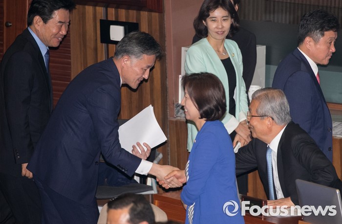 (서울=포커스뉴스) 5일 오후 서울 여의도 국회에서 열린 343회 국회(임시회) 7차 본회의, 정치·외교·통일·안보·교육·사회·문화에 관한 질문에 참석한 표창원 더불어민주당 의원이 질문을 마친 뒤 김종인 비대위 대표 등과 인사하고 있다.